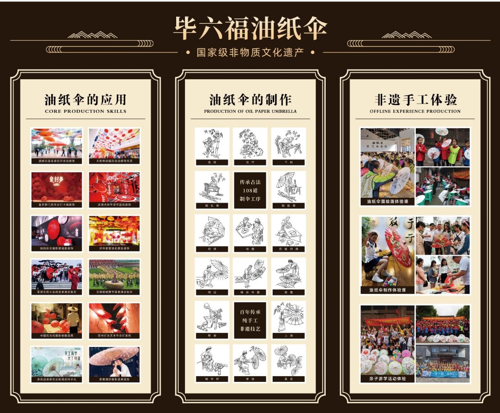 毕六福的油纸伞制作技艺始于1678年(清康熙戊午年),经过上百年传承不息,到毕六福已经是第6代传承人了。2009年,毕六福被国务院授予“国家级非物质文化遗产(油纸伞制作技艺)代表性传承人”,成为中国首位也是唯一一位国家级非遗油纸伞技艺代表性传承人。毕六福传承了比较完整的古法手工油纸伞制作技艺,其传承濒临失传的石印技术和2800多针手工满穿技法制作的《石印龙凤呈祥》油纸伞色彩鲜活夺目做工精良,被业界誉为“民间伞艺的活化石”,其作品被首都博物馆、哈尔滨三五博物馆等竞相珍藏。2011年毕六福注册“毕六福”品牌商标,结束了油纸伞行业无品牌化发展的劣势。2016年,毕六福耗时近1年纯手工制作的16.2米大伞成功挑战吉尼斯世界纪录,被誉为“中国伞王”。