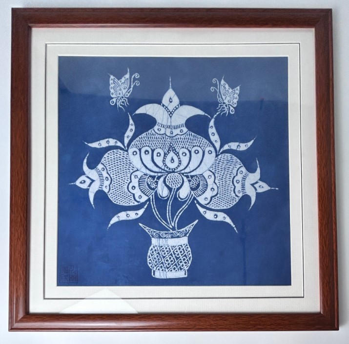 苗族蜡染是苗族同胞从古至今一直使用的一种民间传统纺织印染手工艺,主要用于苗族同胞穿着的百褶裙上。制作方法主要以天然的核桃树皮或板蓝叶子作为植物染料,用蜡刀蘸取蜂蜡溶液在纺织的麻布或棉布上进行描绘,利用蜡与水不溶的原理,经染色后高温水煮脱蜡,作为防染的蜡会自然龟裂,使布面呈现特殊的“冰纹”,使苗族蜡染制品独具魅力。